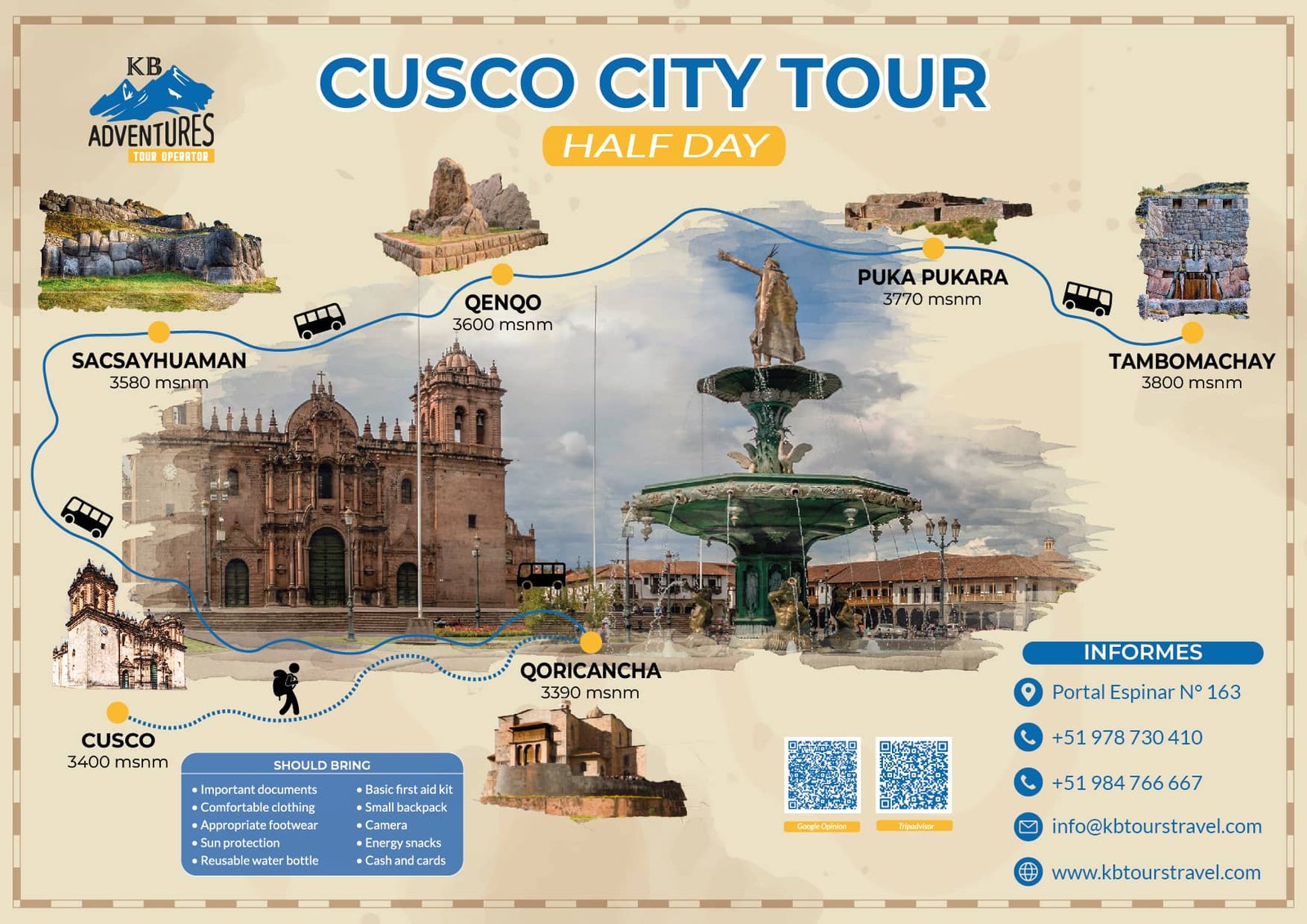 Immerse yourself in the magic and beauty of Cusco and uncover the fascinating Inca history on this half-day city tour. Cusco, once regarded as the Navel of the World by the ancient Inca civilization—one of the largest pre-Columbian civilizations in the Americas—offers a wealth of historical wonders. You will visit the Temple of the Sun (Qoricancha) and explore four captivating Inca archaeological sites on the city’s outskirts: Sacsayhuamán, Qenqo, Puca Pucara, and Tambomachay. Our professional guide will share in-depth knowledge about these incredible sites and their historical significance.