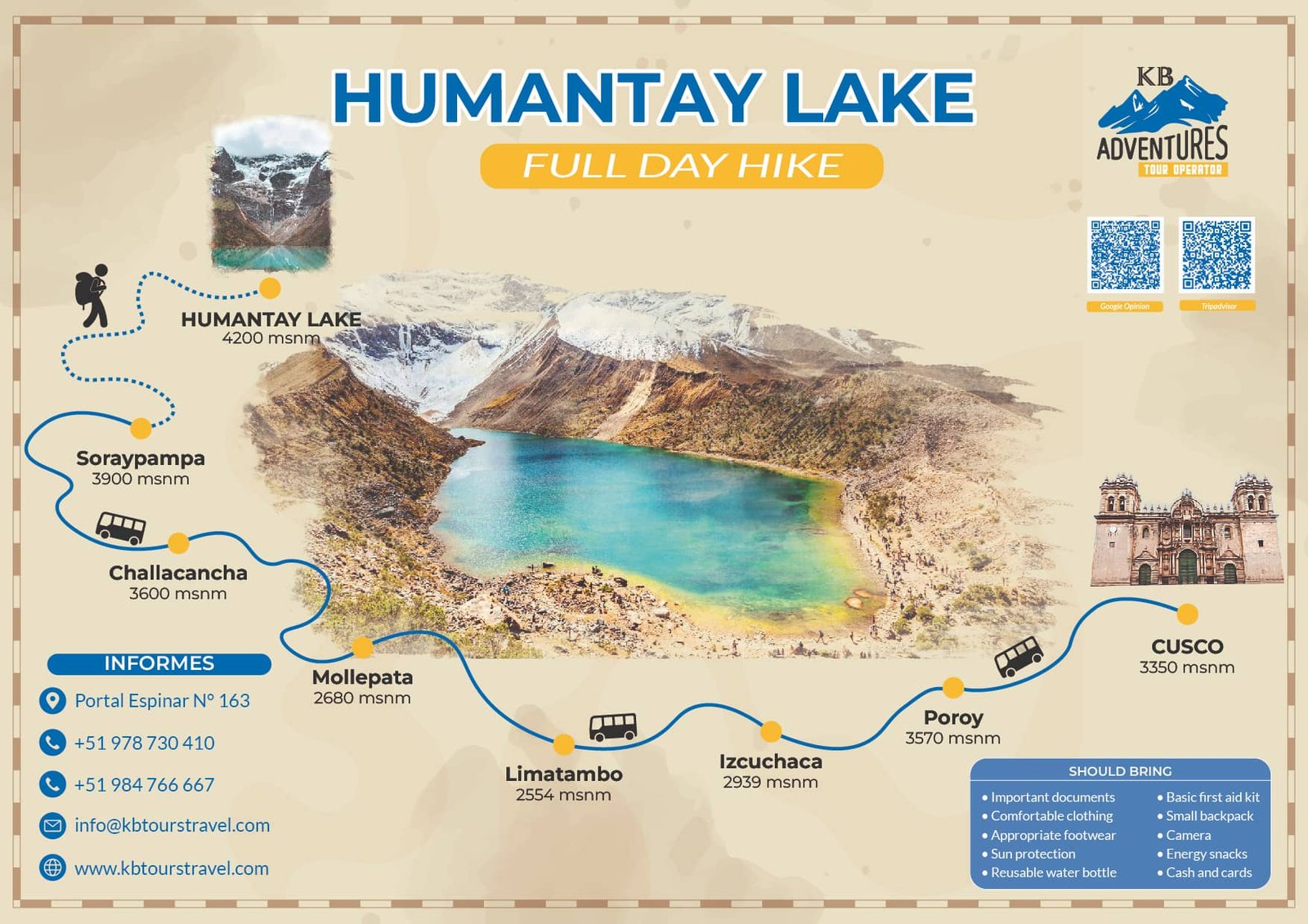 The day before your departure, at 17:00, 18:00 or 19:00, please stop by our office located at Portal Espinar Nro 163 to receive the informative briefing.
