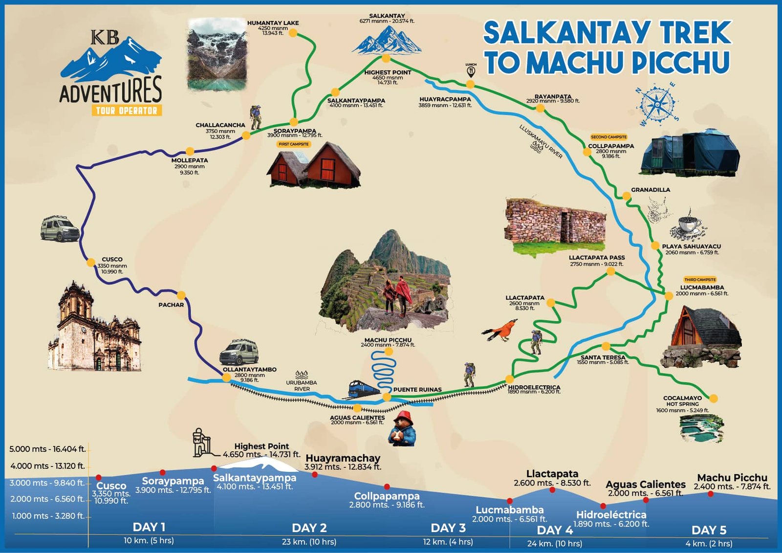 If the cloud conditions are favorable, we will enjoy a close-up view of the snow-capped Salkantay and Humantay mountains during a break in our ascent. After taking in this spectacular natural scene, we will descend from the Salkantay Pass to the base camp on our own, as the guide will continue on the path to Machu Picchu with the rest of the visitors. At the base camp, another guide will be waiting for us and will take us to the bus to return to Mollepata, where we will have lunch before heading back to Cusco.